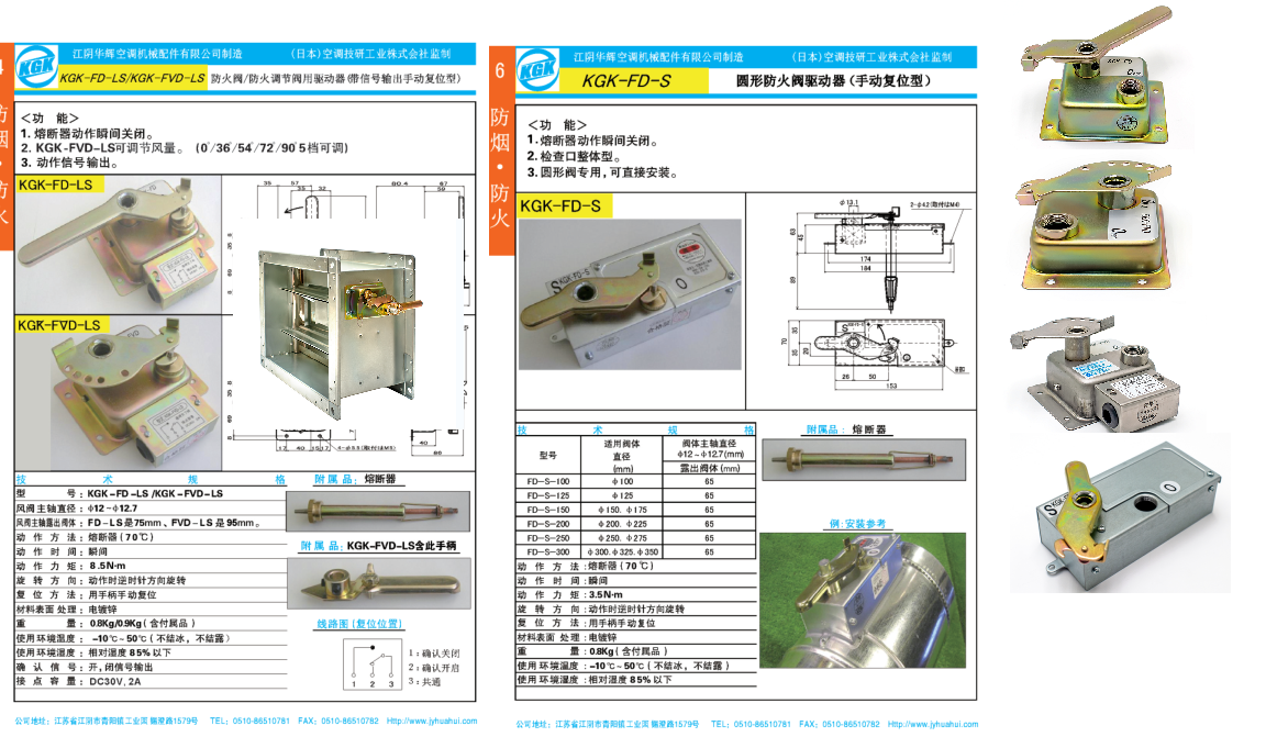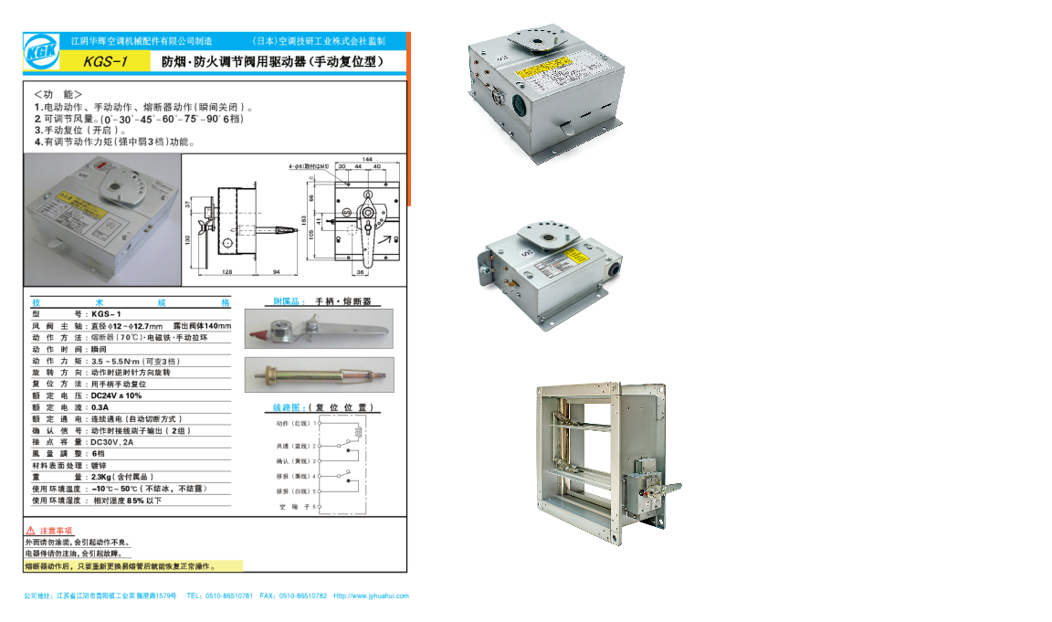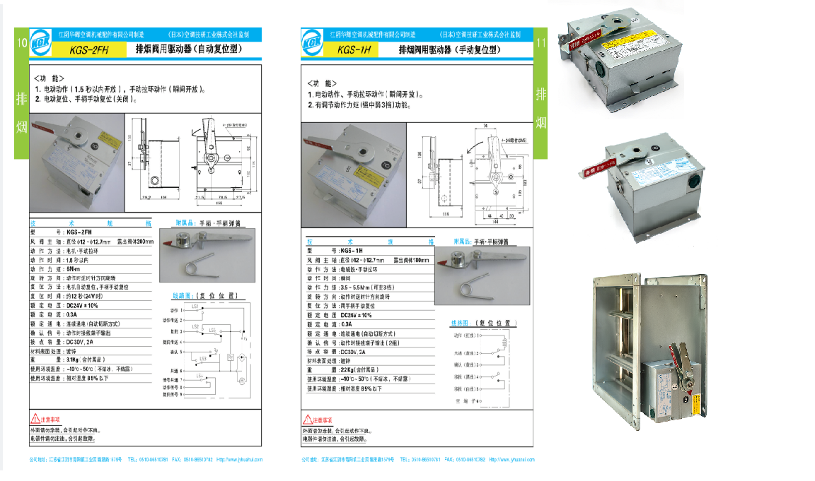 KGK的系列驱动器与江阴华辉的安联系列产品:风量调节阀用驱动器,防火阀用驱动器,排烟阀用驱动器,排烟防火阀用驱动器,排烟口用驱动器,电动阀用驱动器,气动阀用驱动器以及手动控制,电动控制及智能控制的产品均由江阴华辉公司生产。