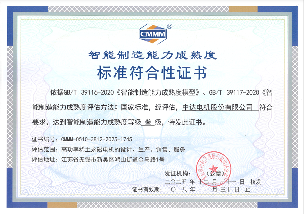 荣获智能制造能力成熟度三级认证,对中达电机而言,是肯定,更是责任与新的开始。